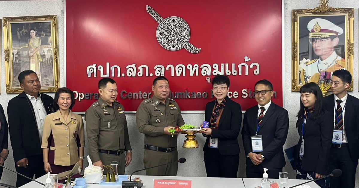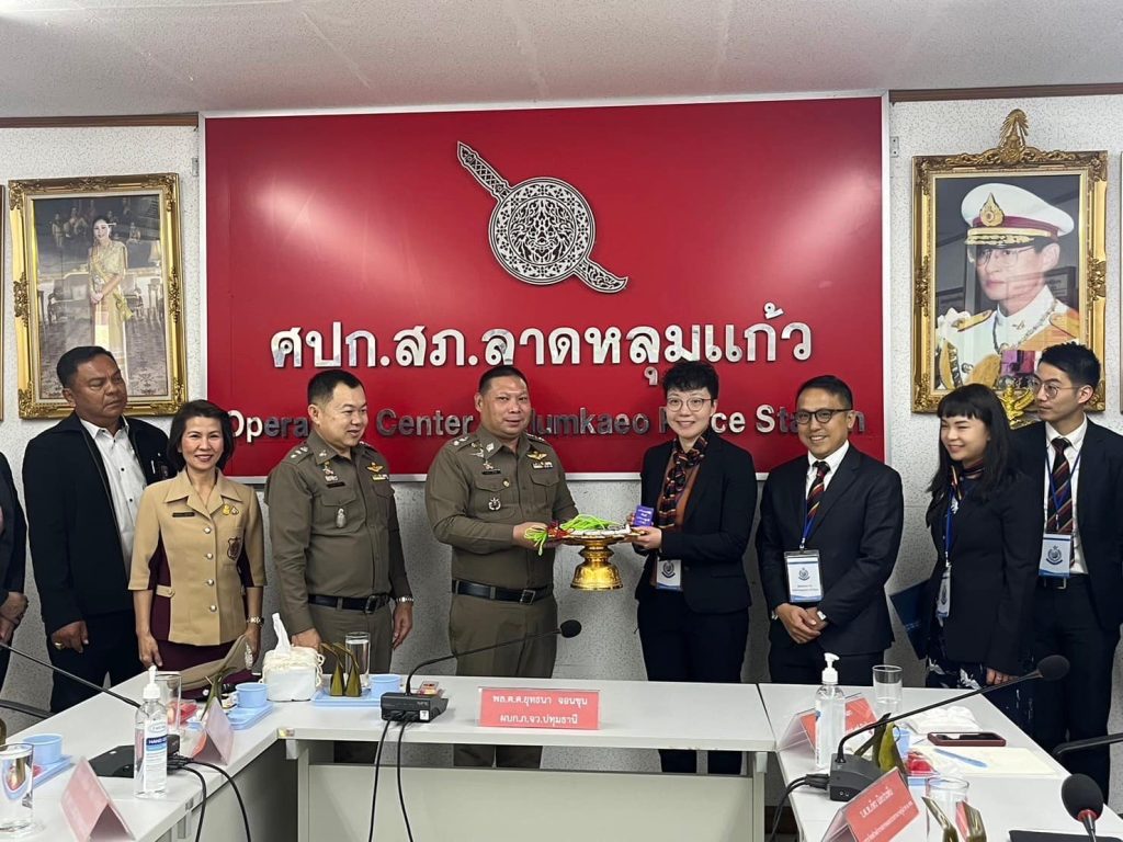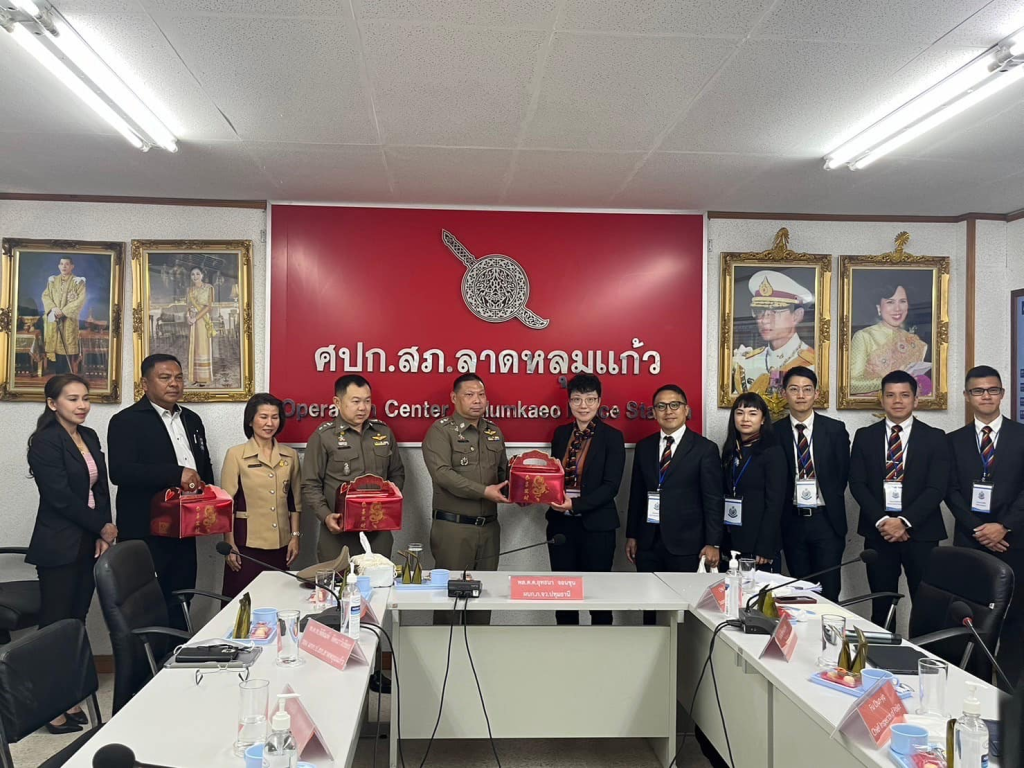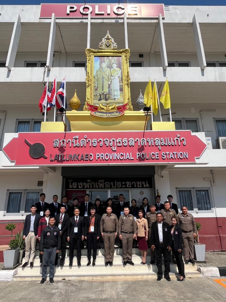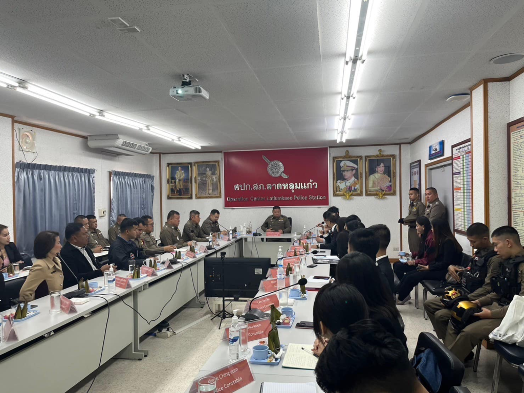สภ.ลาดหลุมแก้ว ภ.จว.ปทุมธานี วันนี้วันพฤหัสบดีที่ 18 ม.ค.2567 เวลา 10.00 น. พล.ต.ต.ยุทธนา จอนขุน ผบก.ภ.จว.ปทุมธานี ,พ.ต.อ.วรยุทธ พงษ์ตัน ผกก.สภ.ลาดหลุมแก้ว,พ.ต.ท.พิสัณห์ ลัคนาวิเชียร รอง ผกก.ป.สภ.ลาดหลุมแก้ว , พ.ต.ท.สมบัติ กาญจนะบุตร รอง ผกก.สส.สภ.ลาดหลุมแก้ว , พ.ต.ท.ปัญญา เหล็กดี รอง ผกก.(สอบสวน)สภ.ลาดหลุมแก้ว ,พ.ต.ท.เด่นพงษ์ ต่อติด สว.อก.สภ.ลาดหลุมแก้ว , พ.ต.ท.นพดล ใจหลวง สวป.สภ.ลาดหลุมแก้ว ,พ.ต.ท.ธนุส วิสุทธาภรณ์ สว.สส.สภ.ลาดหลุมแก้ว พร้อมข้าราชการตำรวจ สภ.ลาดหลุมแก้ว และ นายกิตติศักดิ์ แก้วศรี นางสาวกัญญาณัฐ สุรทัตโชค คณะกรรมการ กต.ตร.สภ.ลาดหลุมแก้ว ร่วมให้การต้อนรับและบรรยายสรุปผลการปฏิบัติหน้าที่ ของ เจ้าหน้าที่ตำรวจ สภ.ลาดหลุมแก้ว ให้กับ คณะศึกษาดูงานจากสำนักงานกลางตำรวจสากลเขตบริหารพิเศษฮ่องกงแห่งสาธารณรัฐประชาชนจีน จำนวน 15 นาย ณ สภ.ลาดหลุมแก้ว