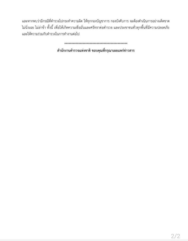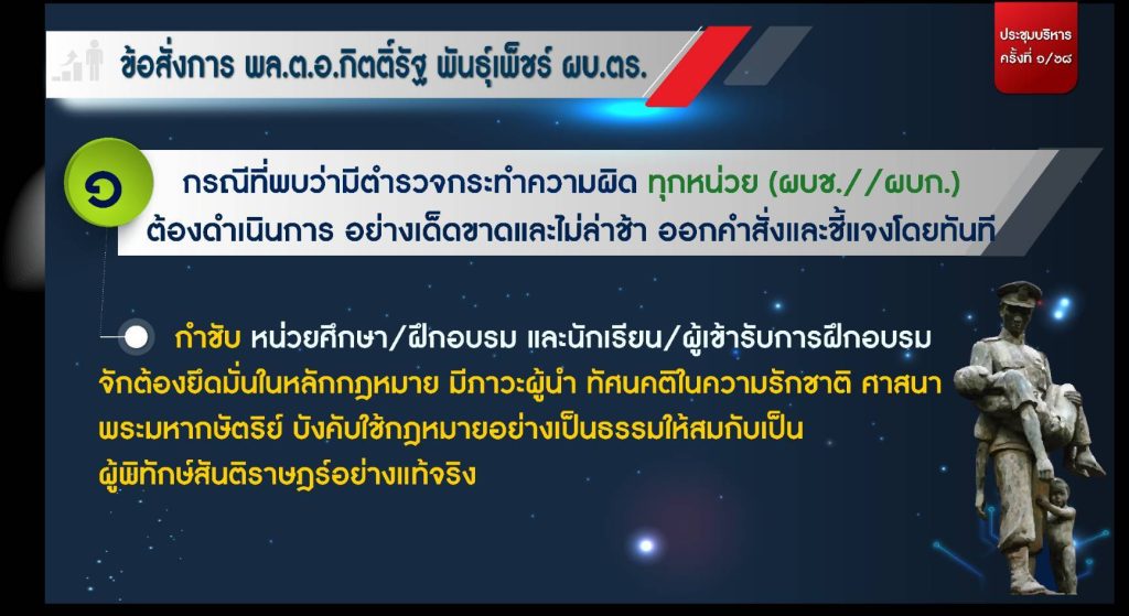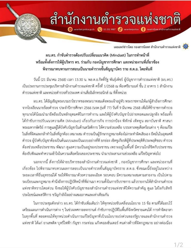ผบ.ตร. กำชับตำรวจต้องปรับเปลี่ยนแนวคิด (Mindset) ในการทำหน้าที่ พร้อมทั้งสั่งการให้ผู้บริหาร ตร. ร่วมกับ กองบัญชาการศึกษา และหน่วยงานที่เกี่ยวข้อง พิจารณาทบทวนการสอบเป็นนายตำรวจชั้นสัญญาบัตร ราย ส.ต.อ. โดยทันที