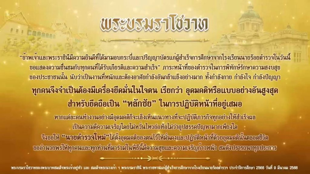 ผบ.ตร. ได้อัญเชิญพระบรมราโชวาทของพระบาทสมเด็จพระเจ้าอยู่หัว พระราชทานให้แก่ผู้สำเร็จการศึกษาจากโรงเรียนนายร้อยตำรวจ ประจำปีการศึกษา 2566 (นรต.รุ่นที่ 77) วันที่ 9 มีนาคม 2568 เพื่อให้ข้าราชการตำรวจทุกนายได้น้อมนำมายึดถือเป็นหลักอุดมคติในการทำงาน และให้ผู้บังคับบัญชาไปถ่ายทอดและปลูกฝัง พร้อมทั้งได้กำชับการปรับแนวความคิด (Mindset) เกี่ยวกับภารกิจ การปกป้อง พิทักษ์ เทิดทูน สถาบันชาติ ศาสนา พระมหากษัตริย์ การดูแลผู้ใต้บังคับบัญชาในด้านสวัสดิการ ให้ความช่วยเหลือ บรรเทาเหตุเดือดร้อนต่าง ๆ ต้องแก้ไขในสิ่งที่ผิดและกล้าทำในสิ่งที่ถูกต้อง เหมาะสม ตำรวจเป็นผู้รักษากฎหมายต้องไม่กระทำผิดเสียเอง ยึดมั่นในอุดมคติตำรวจ ผู้บังคับบัญชาต้องเป็นต้นแบบและเป็นแบบอย่างที่ดี ยกย่อง เชิดชูเกียรติผู้ที่ประพฤติดีประพฤติชอบ ตำรวจต้องช่วยเหลือประชาชน พัฒนา ดูแลความเป็นอยู่ของประชาชน เพราะอยู่ในพื้นที่ มีความใกล้ชิดกับประชาชน ต้องรับฟังและทำความเข้าใจในความเดือดร้อนของประชาชน นำมาประสานงานช่วยเหลือ แก้ไขปัญหาต่อไป