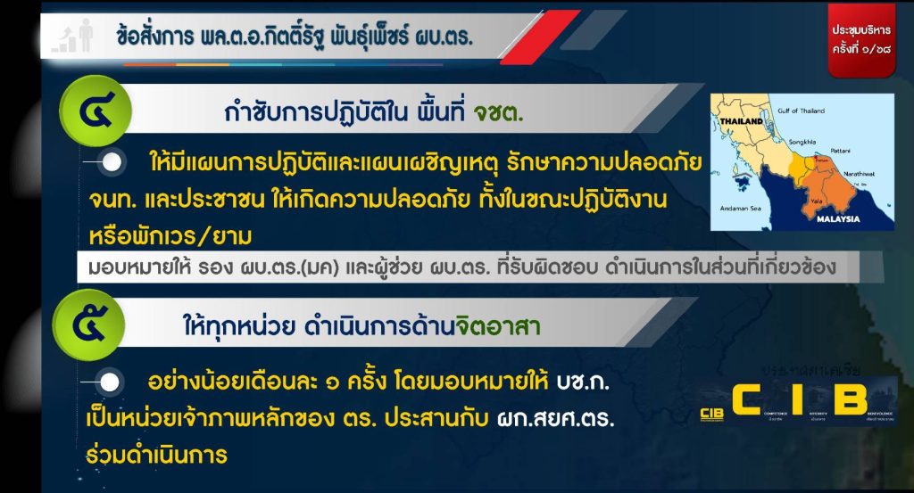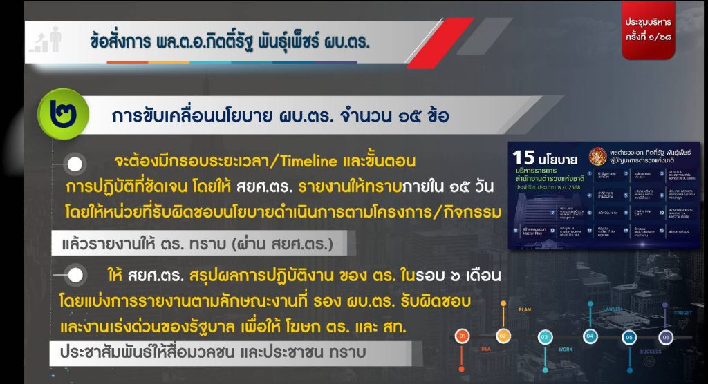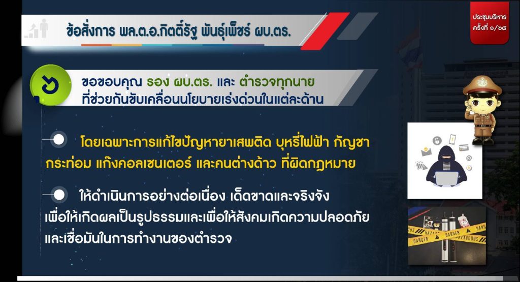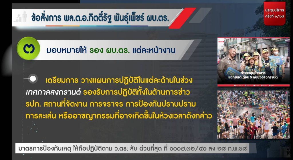 ในการประชุมดังกล่าว ผบ.ตร. ได้กำชับเพิ่มเติมว่า ให้ทุกหน่วยขับเคลื่อนนโยบาย 15 ข้อ ตามที่ได้มอบไว้ เตรียมแผนการดำเนินการต่าง ๆ ในช่วงเทศกาลสงกรานต์ กำชับการปฏิบัติในพื้นที่จังหวัดชายแดนใต้ การทำจิตอาสาในทุกพื้นที่ ตลอดจนให้ทุกหน่วยดำเนินการแก้ไขปัญหาที่เป็นนโยบายเร่งด่วนของรัฐบาลและสำนักงานตำรวจแห่งชาติ ได้แก่ ยาเสพติด บุหรี่ไฟฟ้า กัญชา กระท่อม แก๊งคอลเซ็นเตอร์ คนต่างด้าวที่ผิดกฎหมาย อย่างต่อเนื่อง และหากพบว่ามีกรณีที่ตำรวจไปกระทำความผิด ให้ทุกกองบัญชาการ กองบังคับการ จะต้องดำเนินการอย่างเด็ดขาด ไม่นิ่งเฉย ไม่ล่าช้า ทั้งนี้ เพื่อให้เกิดความเชื่อมั่นและศรัทธาต่อตำรวจ และประชาชนทั่วทุกพื้นที่มีความปลอดภัย และให้ความร่วมกับตำรวจในการทำงานต่อไป