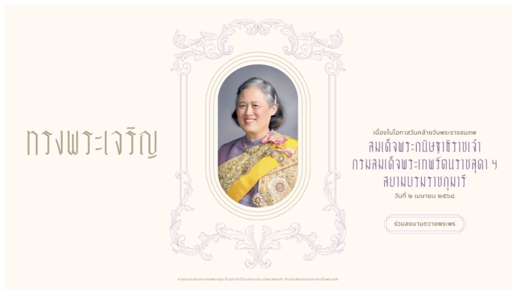 สำนักพระราชวัง ขอเชิญชวนประชาชนร่วมลงนามถวายพระพร สมเด็จพระกนิษฐาธิราชเจ้า กรมสมเด็จพระเทพรัตนราชสุดา เจ้าฟ้ามหาจักรีสิรินธร มหาวชิราลงกรณวรราชภักดี สิริกิจการิณีพีรยพัฒน รัฐสีมาคุณากรปิยชาติ สยามบรมราชกุมารี เนื่องในโอกาสวันคล้ายวันพระราชสมภพ วันที่ 2 เมษายน 2568 ผ่านระบบออนไลน์ ที่เว็บไซต์หน่วยราชการในพระองค์ www.royaloffice.th ระหว่างวันที่ 1 ถึง 3 เมษายน 2568